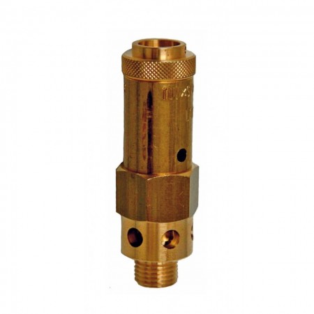Sicherheitsventil aus Messing. Abblasdruck 13 bar, plombiert. Länge: 76 mm, Abblasleistung: 9'630 l/min